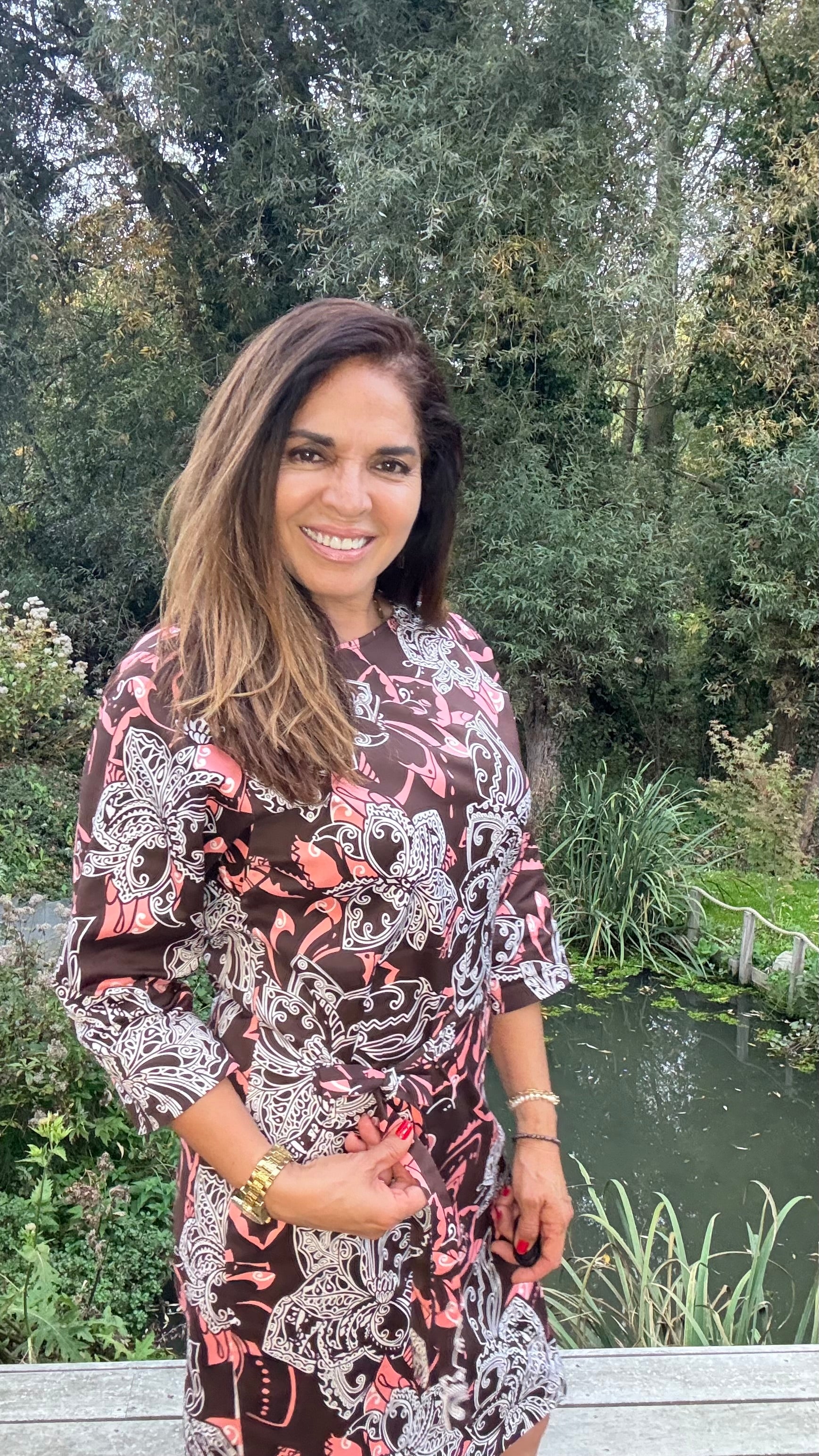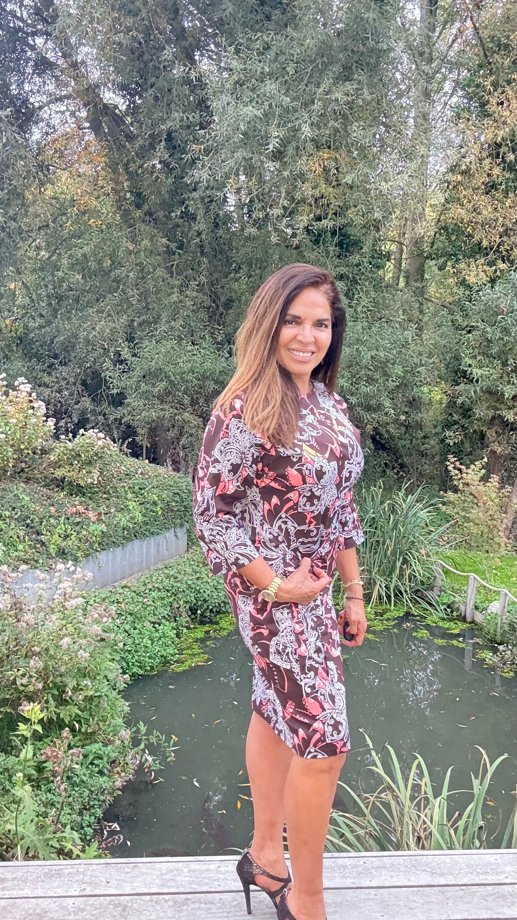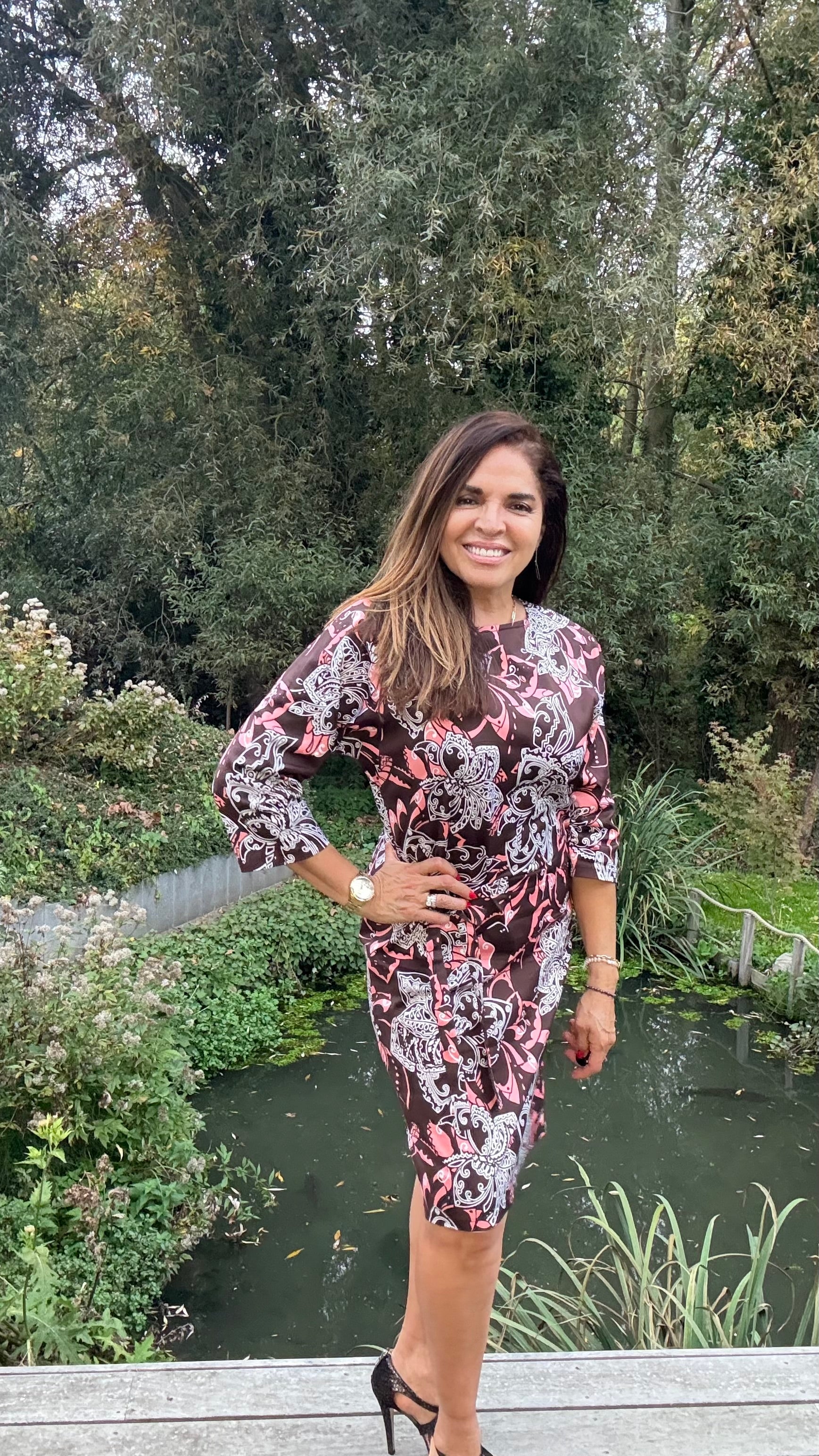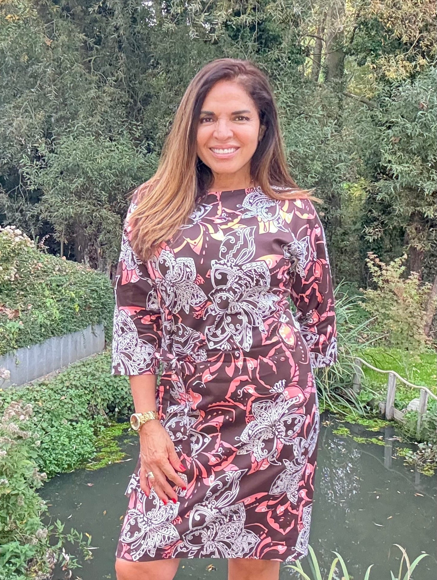 De jurk heeft een rechte snit, knielengte en driekwartmouwen. Hij is bedrukt met een bloem- en paisley-achtig motief in tinten chocoladebruin, zachtroze en wit. De stof valt elegant en accentueert het figuur op een subtiele manier. In de taille zit een strik van dezelfde stof, die het silhouet mooi benadrukt. De halslijn is rond en gesloten, wat de look een verfijnde en klassieke uitstraling geeft. De outfit wordt afgewerkt met taupekleurige pumps die perfect bij de warme kleuren van de jurk passen.