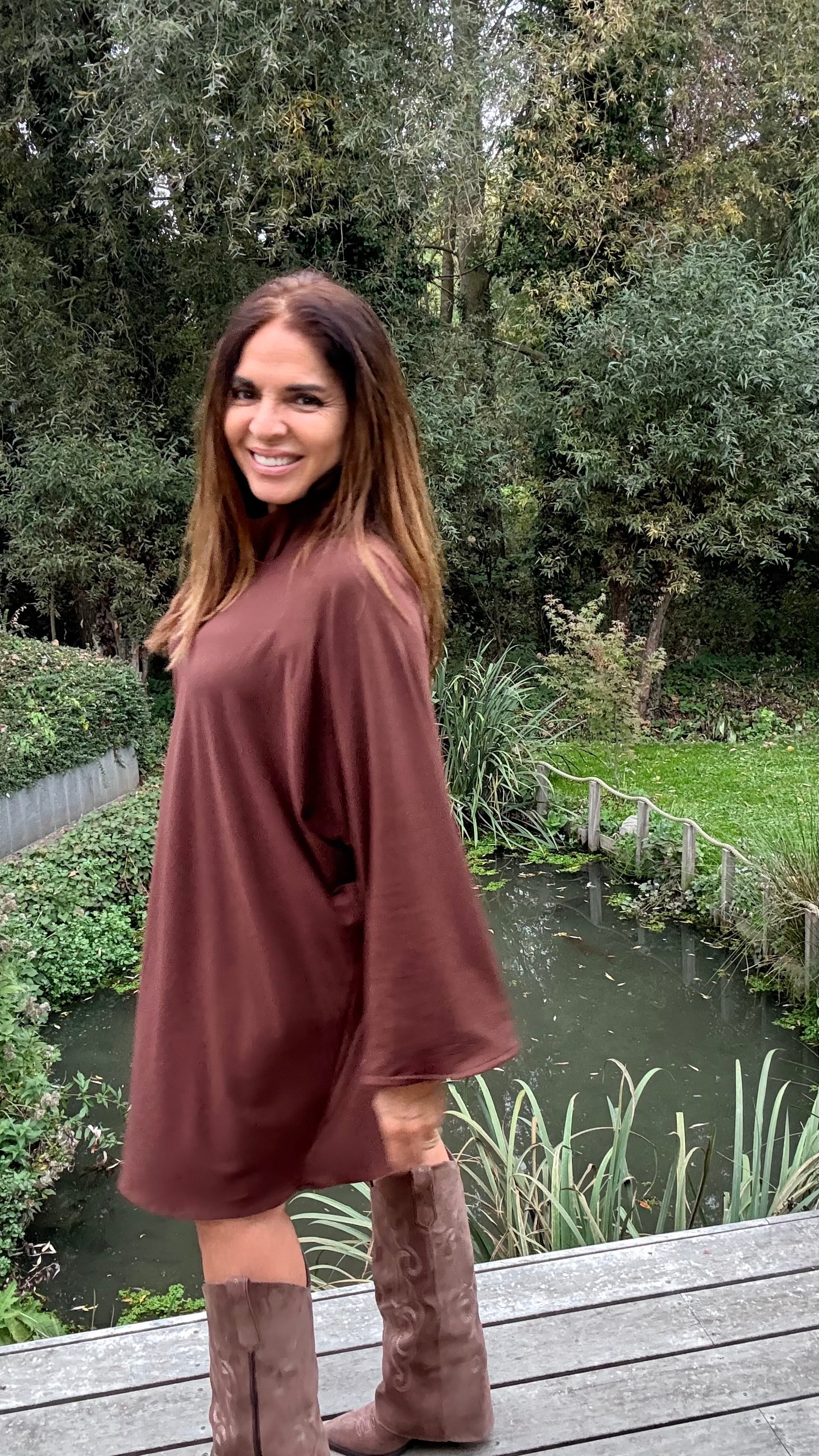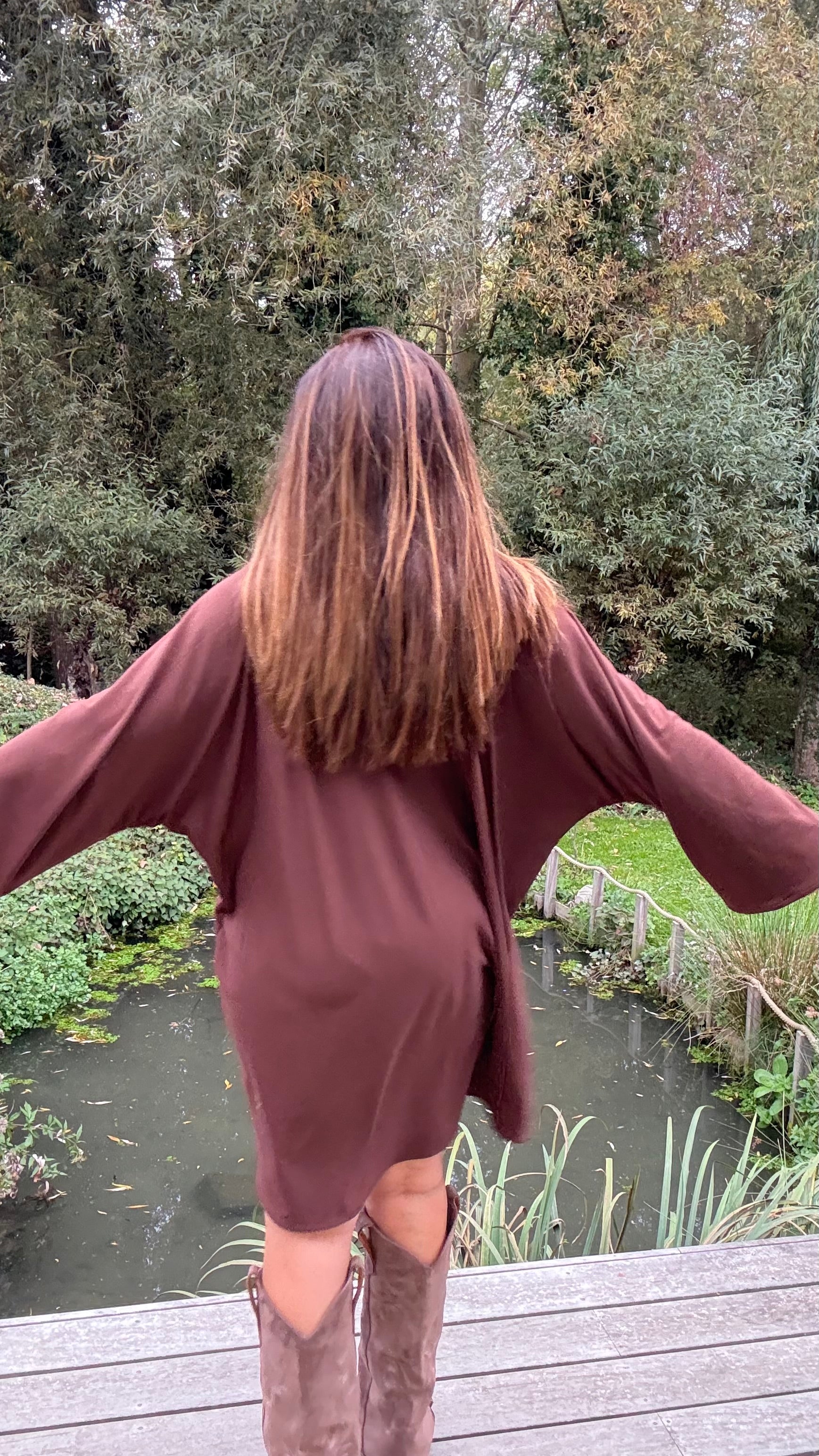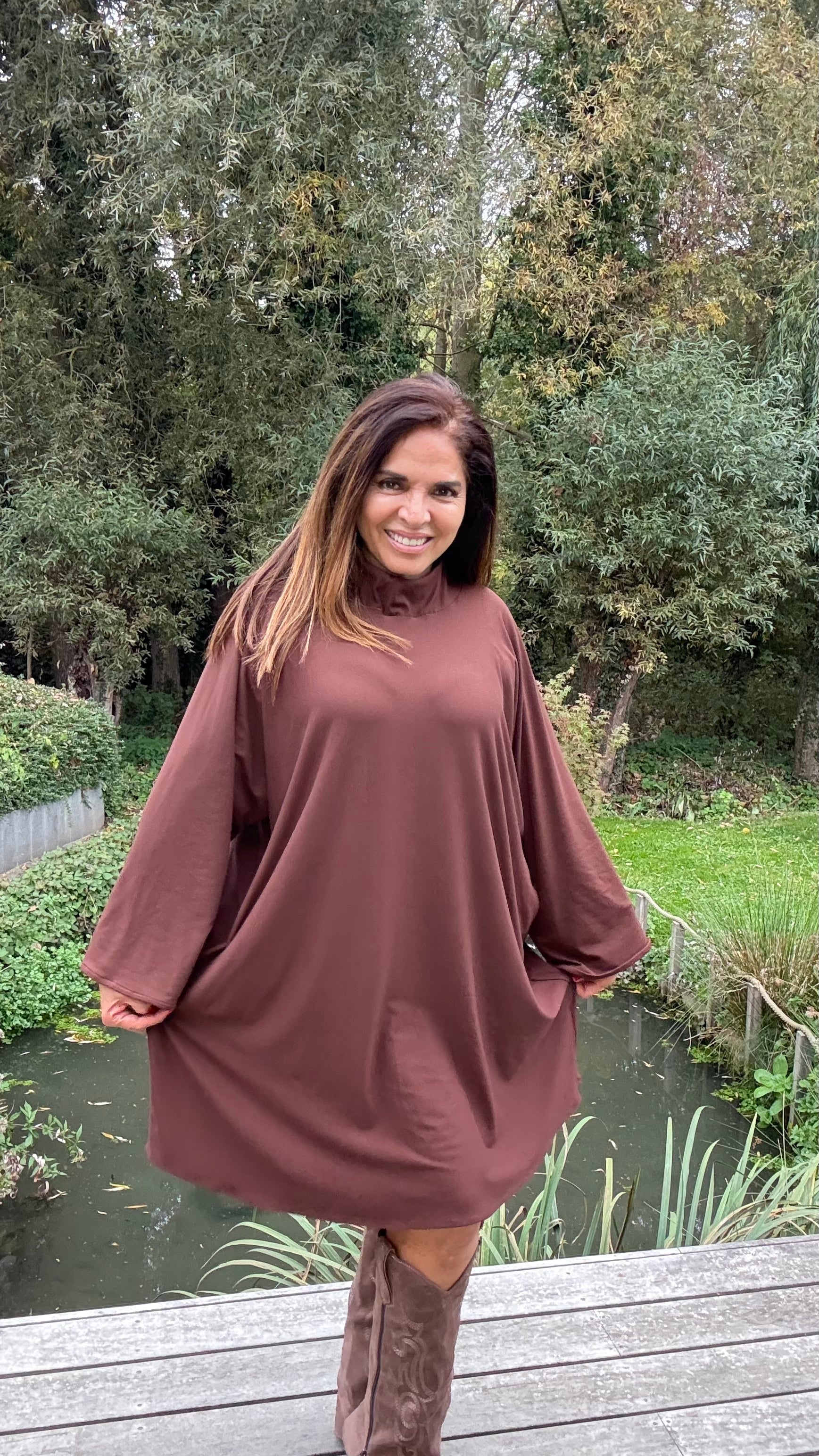 Deze oversized jurk in mokka is mijn eigen ontwerp — licht, soepel en ongelooflijk comfortabel.