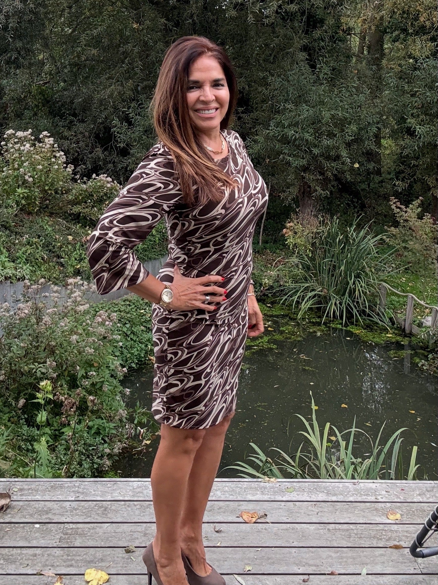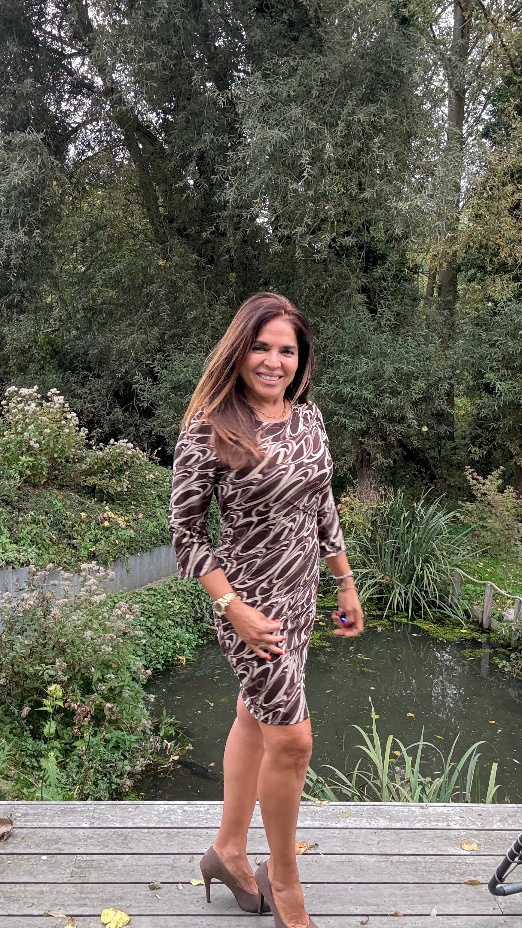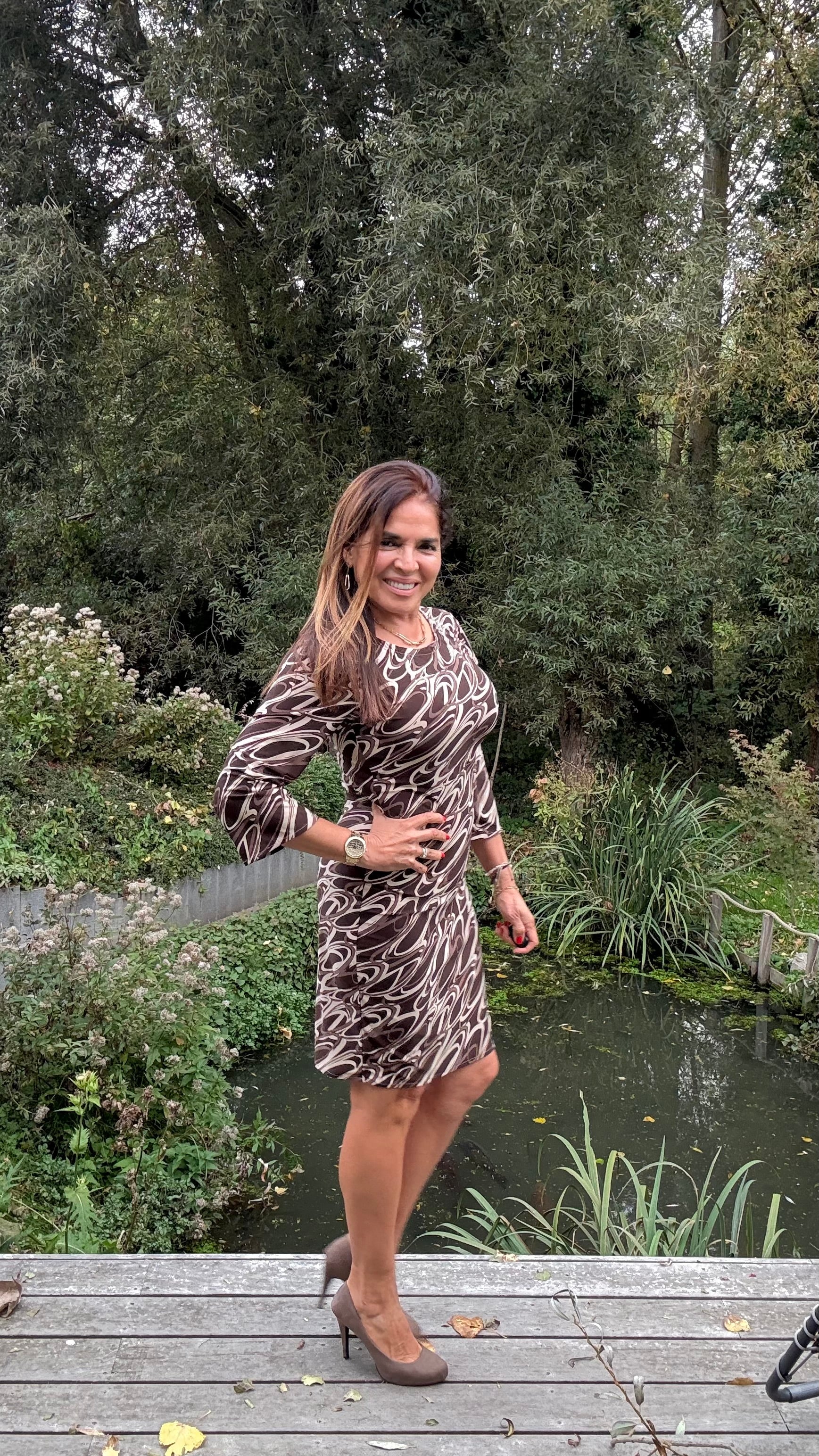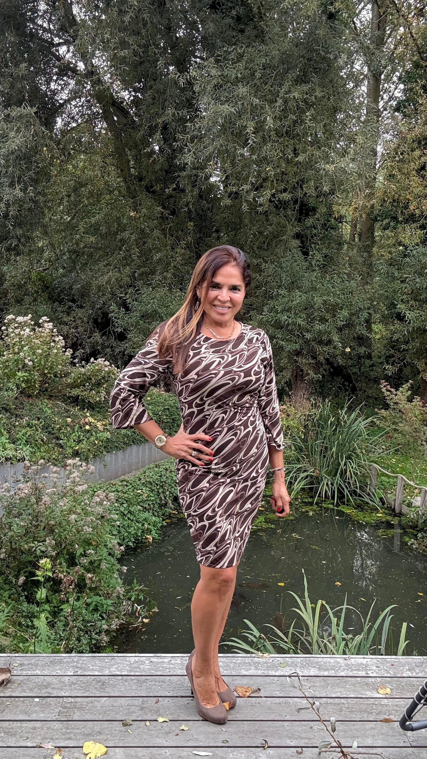 GG124 Getailleerde Stretch Jurk met Lange Mouwen – Donkerbruin & Beige