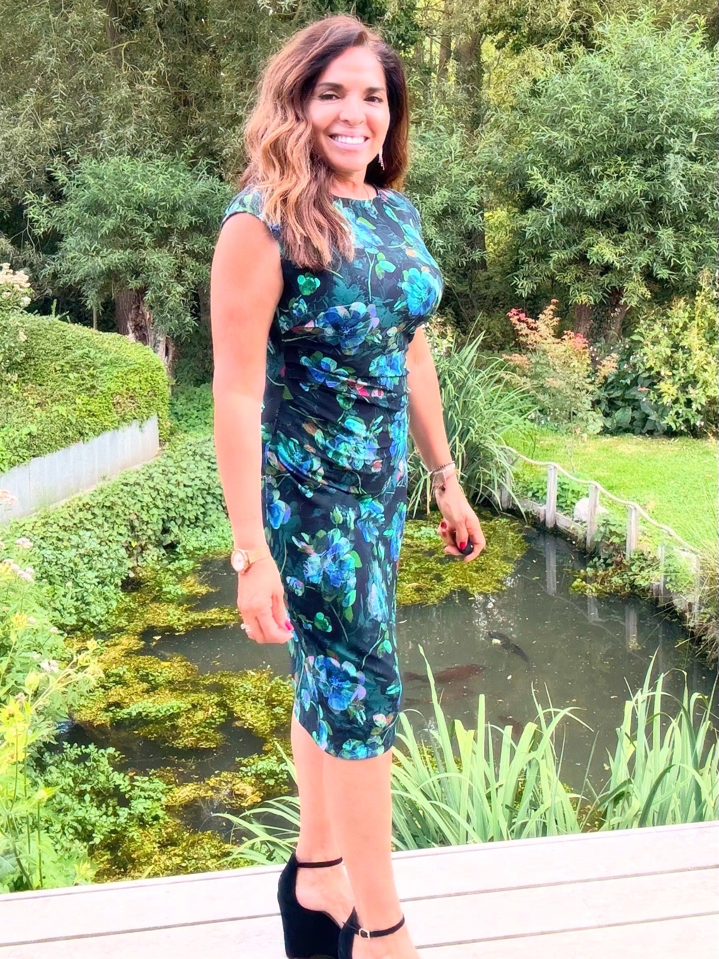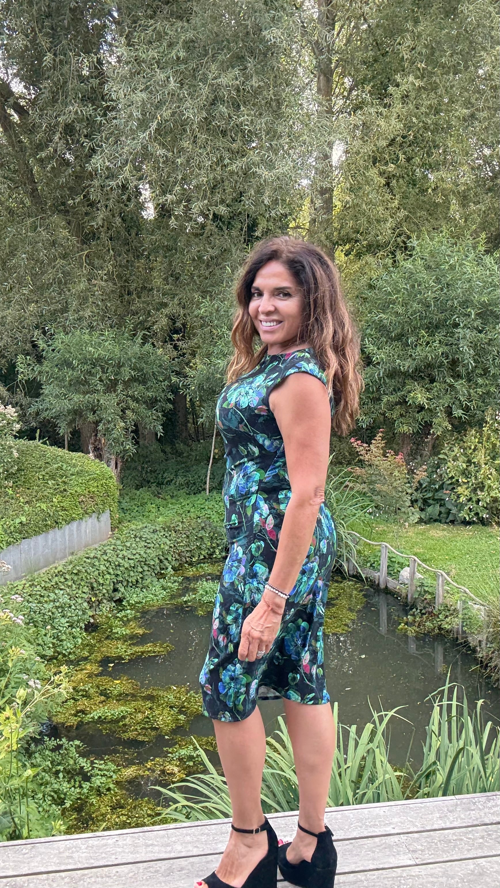 Deze elegante jurk combineert comfort, vrouwelijkheid en een flatterende pasvorm.Gemaakt van een soepele stretchstof met zwarte basis en subtiele groene bloemdetails, sluit ze perfect aan op het lichaam en benadrukt ze de natuurlijke vormen.